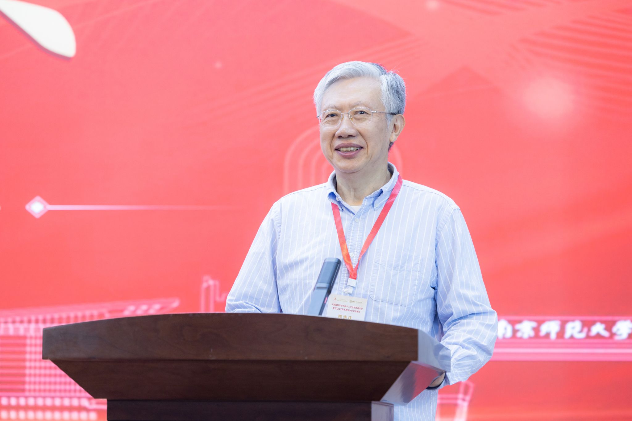 程崇庆代表江苏省数学学会致辞。他对江苏省科学技术协会给予江苏省数学学会的关心和指导、对南师大及数科院对大会召开给予的支持和帮助、对全体会员单位对江苏省数学学会及本次大会召开给予的支持和配合表示感谢,他期待未来江苏省数学学会能够取得长足进步和美好发展。